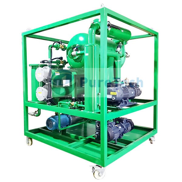 4. Vacuum Pump system: it adopts a double-stage high vacuum pump system, used for evacuation of gases and create a vacuum for the degassing system. While it is not working for oil dehydration, it can be used standalone, as a separate vacuum pump system for transformer evacuation, to dry transformers and the insulation paper.